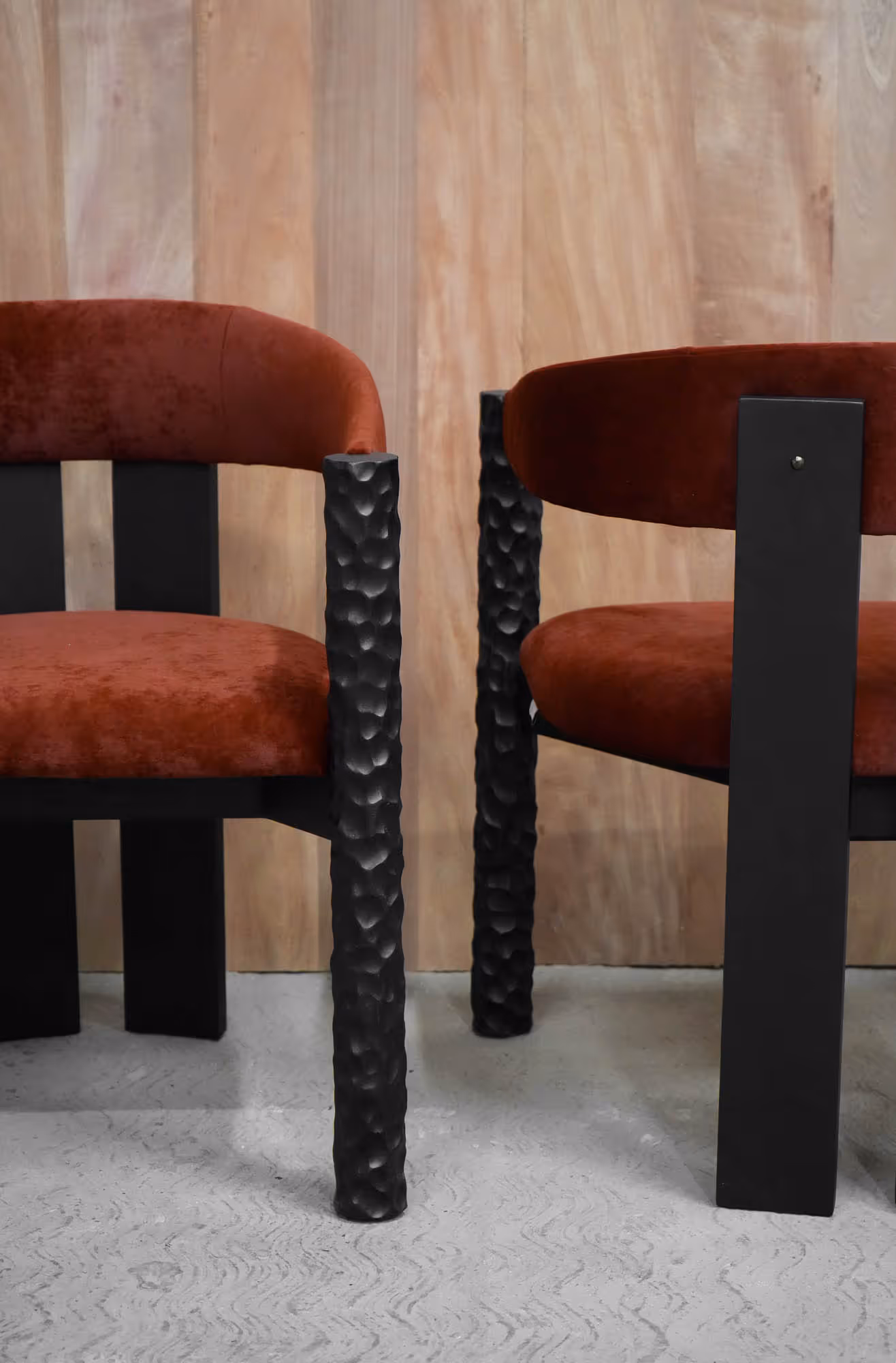 Silla con patas frontales labradas en madera, que aportan textura y carácter artesanal. Su respaldo en corbatura le brinda confort y dinamismo, siendo en conjunto, una pieza versátil y elegante.